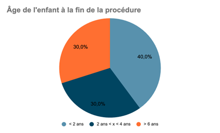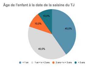 17. Âge variable de l’enfant. Un dernier point mérite d’être relevé, quoiqu’il soit difficile à analyser. Il s’agit de l’âge de l’enfant à la date de la saisine du Tribunal judiciaire de Nanterre. La juridiction est saisie avant les deux ans de l’enfant dans la majorité des affaires (huit cas sur dix), mais pas nécessairement avant son premier anniversaire (quatre cas sur dix). Parfois, la saisine de la juridiction a lieu bien plus tard (quasiment aux sept ans de l’enfant[62]). De prime abord, l’on pourrait penser que lorsque la législation étrangère impose l’intervention d’une décision de justice pour établir la filiation des parents d’intention, la procédure à l’étranger est plus longue et la saisine du Tribunal de Nanterre est plus tardive. L’étude des décisions ne confirme pas cette hypothèse. D’abord, la décision étrangère est rendue rapidement après la naissance de l’enfant, encore que la rédaction du nouvel acte de naissance prenne parfois du temps[63]. Ensuite, les décisions révèlent que la juridiction peut être saisie très rapidement après la naissance de l’enfant en matière d’exequatur (quatre mois de l’enfant[64]) comme très tardivement en matière d’adoption (deux ans et un mois[65]).