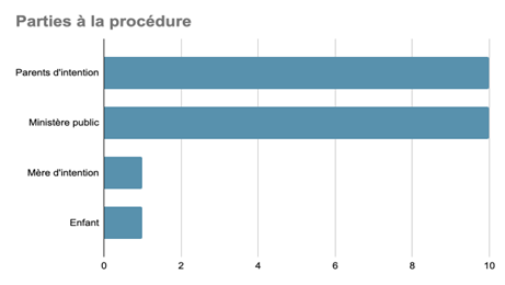 À l’inverse, dans les demandes d’adoption, la procédure est gracieuse. La personne candidate à l’adoption est partie demanderesse, tandis que le parent légal, voire les deux parents légaux dans le cas de la demande d’adoption simple, est indiqué comme « autre partie ». Le ministère public est, quant à lui, partie jointe. L’affaire est cette fois débattue en chambre du conseil. Là encore, la représentation est obligatoire[69]. On relève que, dans la majorité des cas (cinq sur sept), le couple est assisté par un avocat[70].