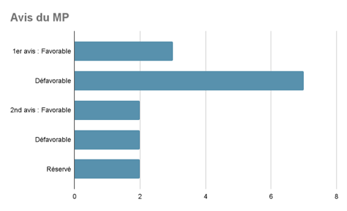 En matière d’adoption, l’avis du ministère public n’est favorable que lorsque la demande vise une adoption simple. Pour toutes celles en adoption plénière, il est défavorable. Le parquet estime que les pièces produites ne permettent pas de vérifier si les conditions imposées par la loi française sont réunies. À la suite de cet avis, les parties tentent de répondre aux griefs formulés par le parquet, soit en produisant des pièces complémentaires, soit en formulant des explications pour éclairer la juridiction sur l’absence de certaines pièces lors de l’audience. Au regard de ces nouveaux éléments, le ministère public émet un second avis lors de cette même audience. Celui-ci est favorable au prononcé de l’adoption plénière dans un tiers des cas, défavorable dans un autre tiers des situations, réservé dans le dernier tiers des affaires.