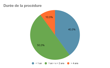 22. Célérité variable de la procédure. On constate encore que la procédure suivie devant le Tribunal judiciaire de Nanterre est plus ou moins longue. Dans la grande majorité des affaires, entre la date de saisine du tribunal et le délibéré, s’est écoulé moins d’un an et demi. Dans une affaire seulement, la procédure, émaillée de divers incidents d’instance (deux radiations) s’est, au contraire, déroulée sur plusieurs années (plus de quatre ans)[76].